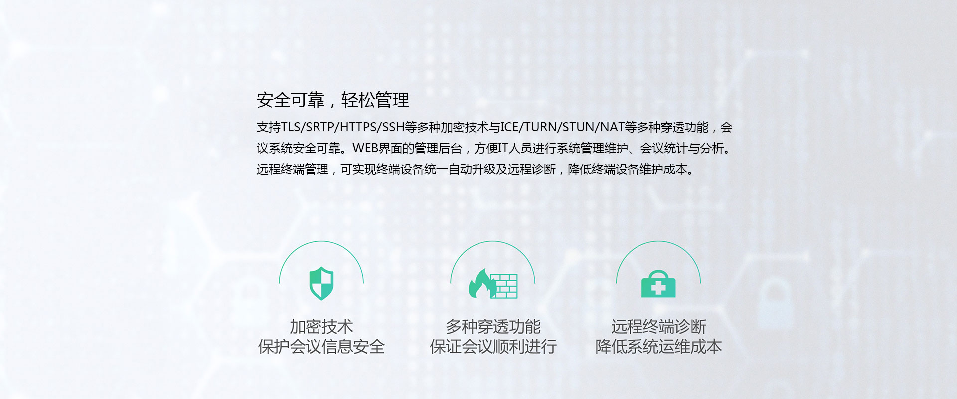 有MCU;可全編全解;有高清端口適配;有畫面輪詢;有預約實體會議室;有Ad-Hoc即時會議;有主席(或培訓)模式會議;可點對點會議;可終端一鍵入會;有WEB管理界面;會議統計與分析;服務端固件遠程升級;系統備份與還原