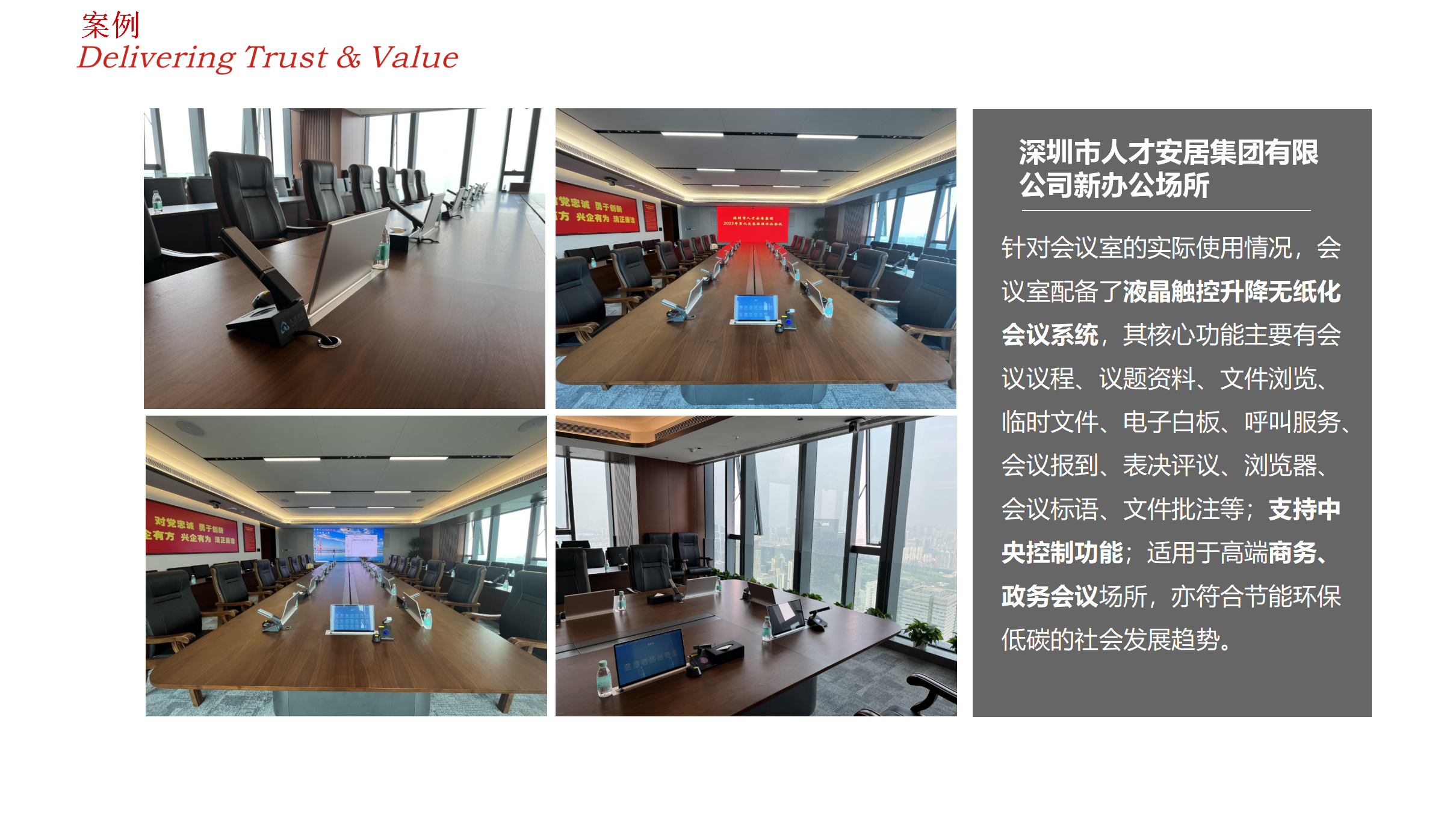 • 無紙化會議系統(tǒng) 是集現(xiàn)代通信技術(shù)、專業(yè)音視頻技術(shù)、智能化控制技術(shù)、軟件技術(shù)于一體的新型會議模式,通過無紙化管理平臺實現(xiàn)文件的電子交換,從而實現(xiàn)會議的無紙化功能;具有傳輸網(wǎng)絡(luò)化、顯示電子化、編輯智能化、輸入輸出可控化四大特征; 使用過程中與會者之間的信息可實時交互,使用便捷高效。
